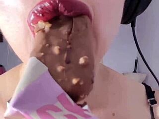 giantess with big lips and eyeglasses contrasts huge tall fetish while eating snickers protein bar