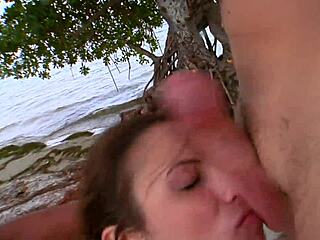 Sensual threesome with brunette pornstar at beach